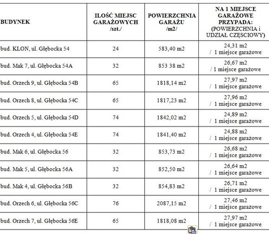 Tabela poniżej przedstawia tzw. przypadającą na 1 miejsce garażowe wielkość udziału w nieruchomości wspólnej (podane w m2, lecz na przykładzie hali garażowej w bud. Głębocka 56C na 1 udział w lokalu garaż przypada 27,46m2 = 2746 udziałów odnoszących się do nieruchomości wspólnej)